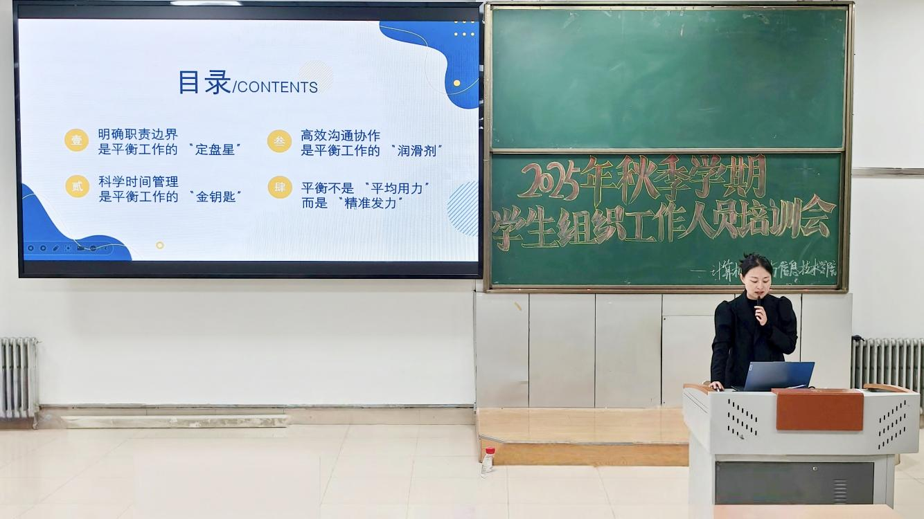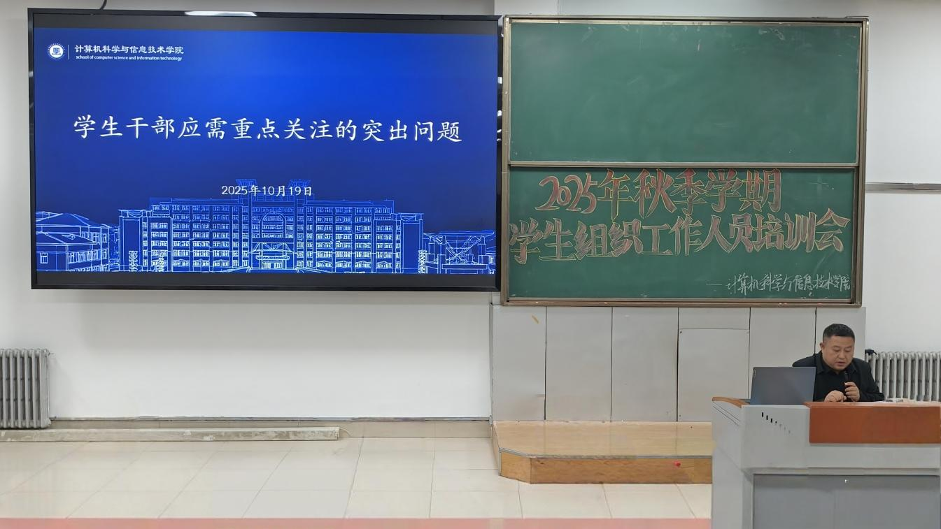 为加强学生骨干队伍建设,提升学生骨干综合素质和工作能力,10月19日,计算机科学与信息技术学院在计算机楼113教室召开2025年秋季学期学生骨干培训会。本次培训会由2022级辅导员刘烁主持,党总支副书记刘彰基、副处级辅导员吴鹏、学生工作办公室副主任苏鸿鹏、2024级辅导员闫令文、2023级辅导员秦莹、组织员姜怡楠和全体学生骨干参会。