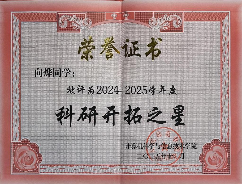 曾荣获国家奖学金、校级一等奖学金,获评黑龙江省三好学生、校铁人式优秀共青团员等多项荣誉称号;大一期间先后通过了英语四六级考试;获2025年“建行杯”中国国际大学生创新创业大赛黑龙江赛区铜奖、2025年中国大学生计算机设计大赛国赛三等奖、第十六届蓝桥杯大赛黑龙江赛区 Web 应用开发大学组二等奖等省级及以上奖项7项,获软件著作权1项;担任院数字媒体中心副部长与班级权益委员期间,工作尽责,协调有力;积极投身志愿服务,志愿服务累计69小时,同时系国家级“两弹一星”志愿服务团队成员,参与多场宣讲。