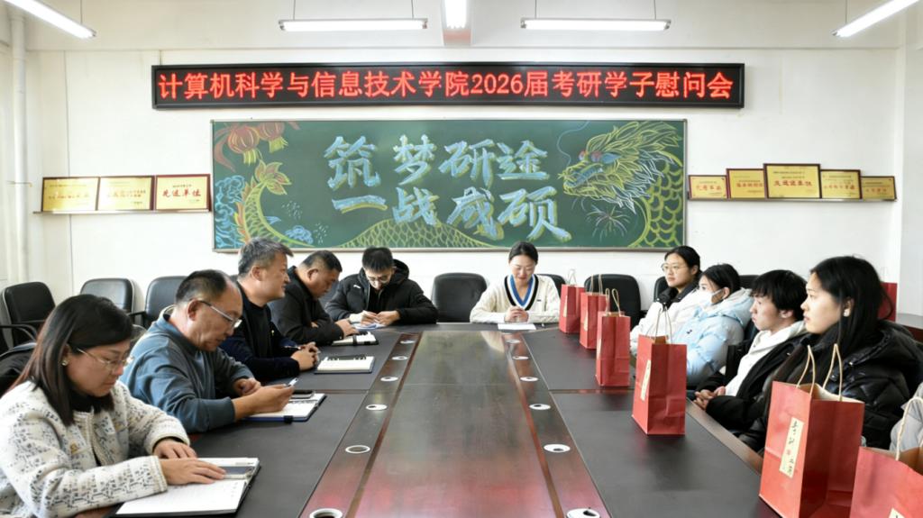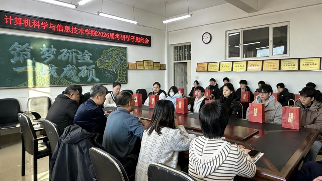 为扎实做好考研学子服务保障与冲刺助力工作,切实传递学院关怀、坚定计科学子备考信心,12月17日,计算机科学与信息技术学院召开2026届考研学子慰问会,学院院长王健、党总支副书记刘彰基、副院长贾美娟、副处级辅导员吴鹏、学生工作办公室副主任苏鸿鹏、2026届毕业生辅导员刘烁及各教研室主任为即将奔赴考场的计科学子送上深切厚望与暖心祝福。