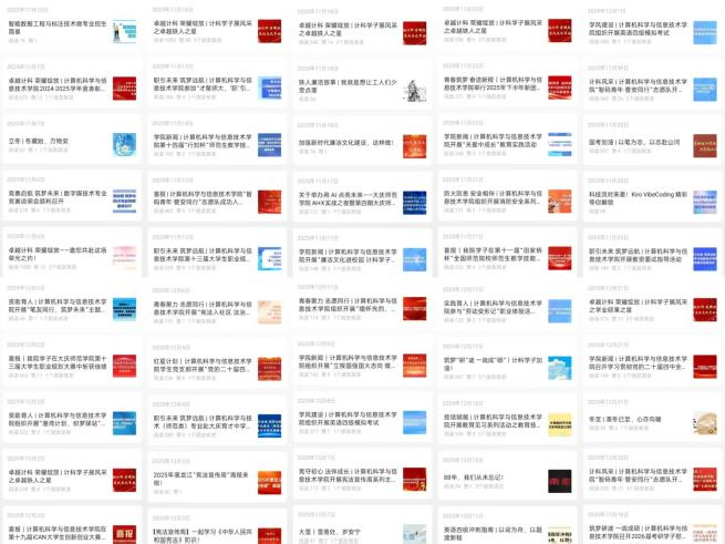 学院紧抓互联网时代思政工作新机遇,加强融媒体平台建设,构建主流思想传播阵地。定期开展网评员能力培训,培育高素质宣传骨干队伍;持续运营“悦享计科”“庆师数智先锋”等新媒体品牌,2025年发表推文339篇、总阅读量8.1万余次,发布视频64个、浏览量9.5万余次、转发量2000余次,精准传递主流价值,筑牢学生网络思想阵地,让思政教育更具感染力与传播力。
