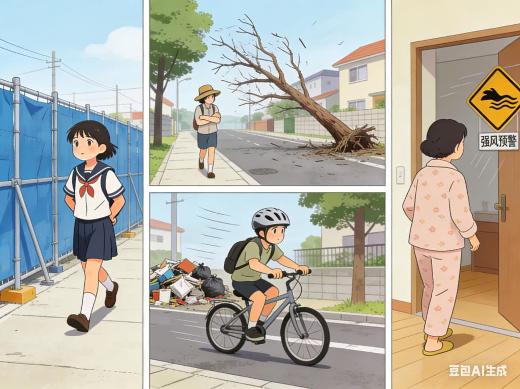 3.步行或骑行时,尽量选择开阔、无遮挡的安全路线,远离易被大风卷起杂物的区域,防止被飞溅物击伤。